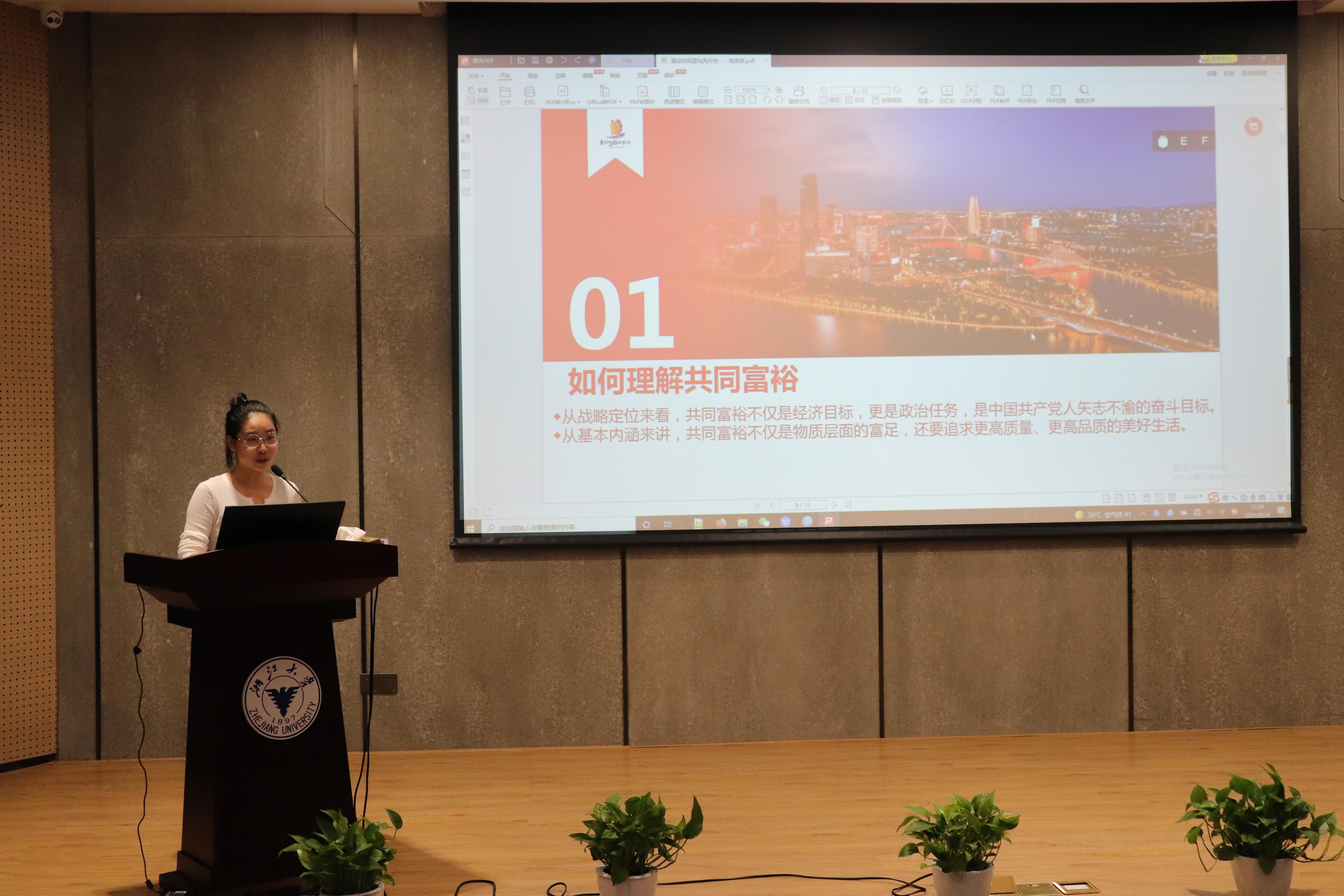 为落实学校党委宣传部关于“开学第一课”相关工作,9728太阳集团于9月24日晚开展“共同富裕”青年理论主题宣讲会,学工办沈樱枝老师主讲。