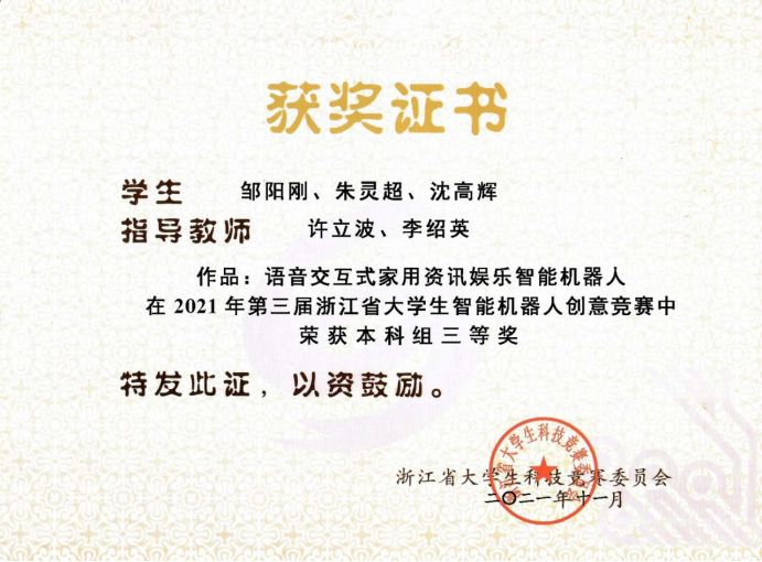 近日,在由浙江省大学生科技竞赛委员会主办的第三届浙江省大学生智能机器人创意竞赛中,我院由张浩澜、卢焕达老师指导,电气求是班姜轶剑、数据科学与大数据技术专业王焕焕, 陈帆同学组成的团队荣获二等奖;由许立波、李绍英老师指导,数据科学与大数据技术专业邹阳刚、朱灵超、沈高辉同学组成的团队荣获三等奖。