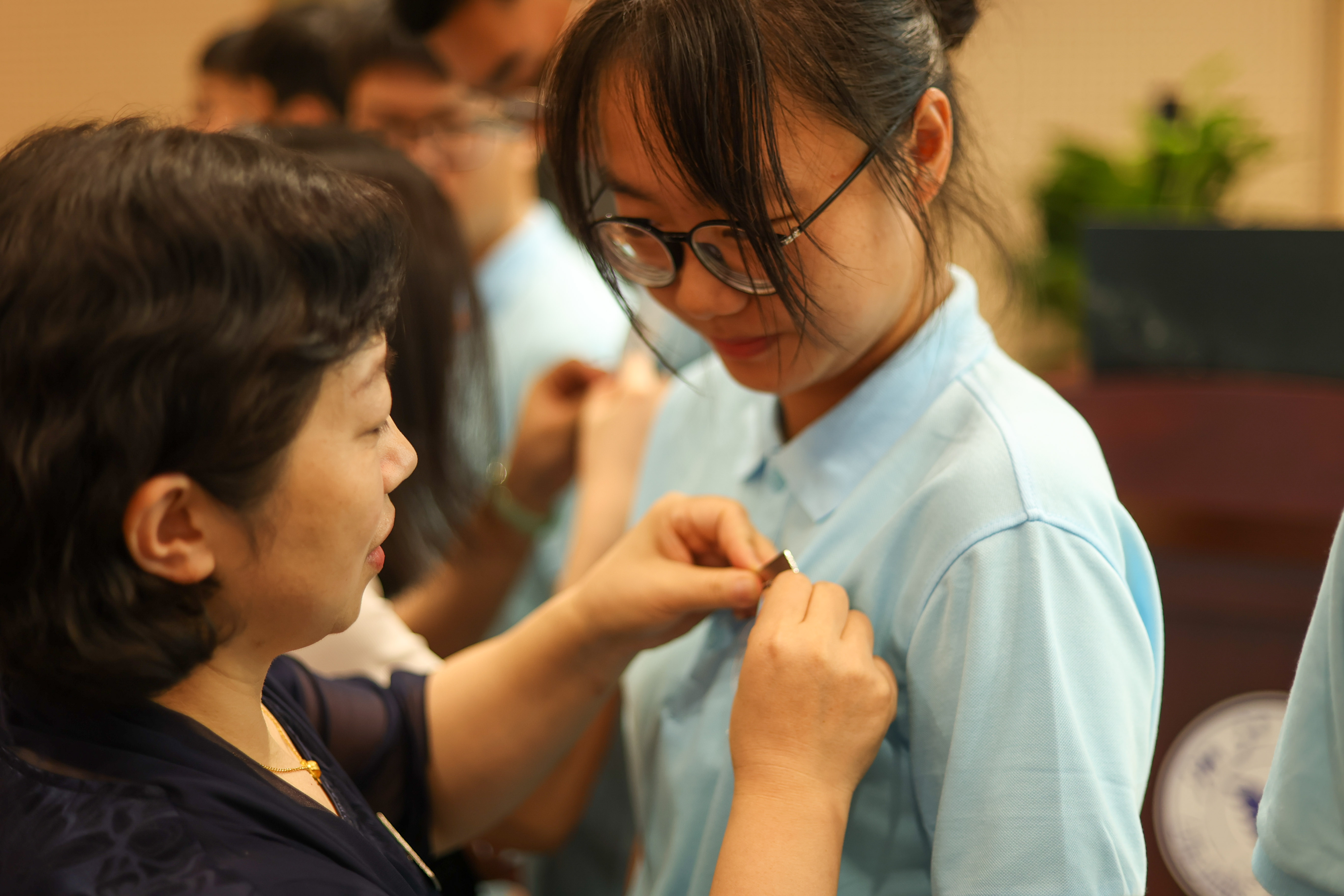 恰逢建校20周年校庆日,学院党委副书记汪洪老师简单介绍了建校历程和校庆事宜。大会安排“庆校庆、戴校徽”新生校徽佩戴仪式,在澎湃激昂的校歌声中,领导老师们给新生佩戴校徽,让师生共同感受作为宁理人的荣光。