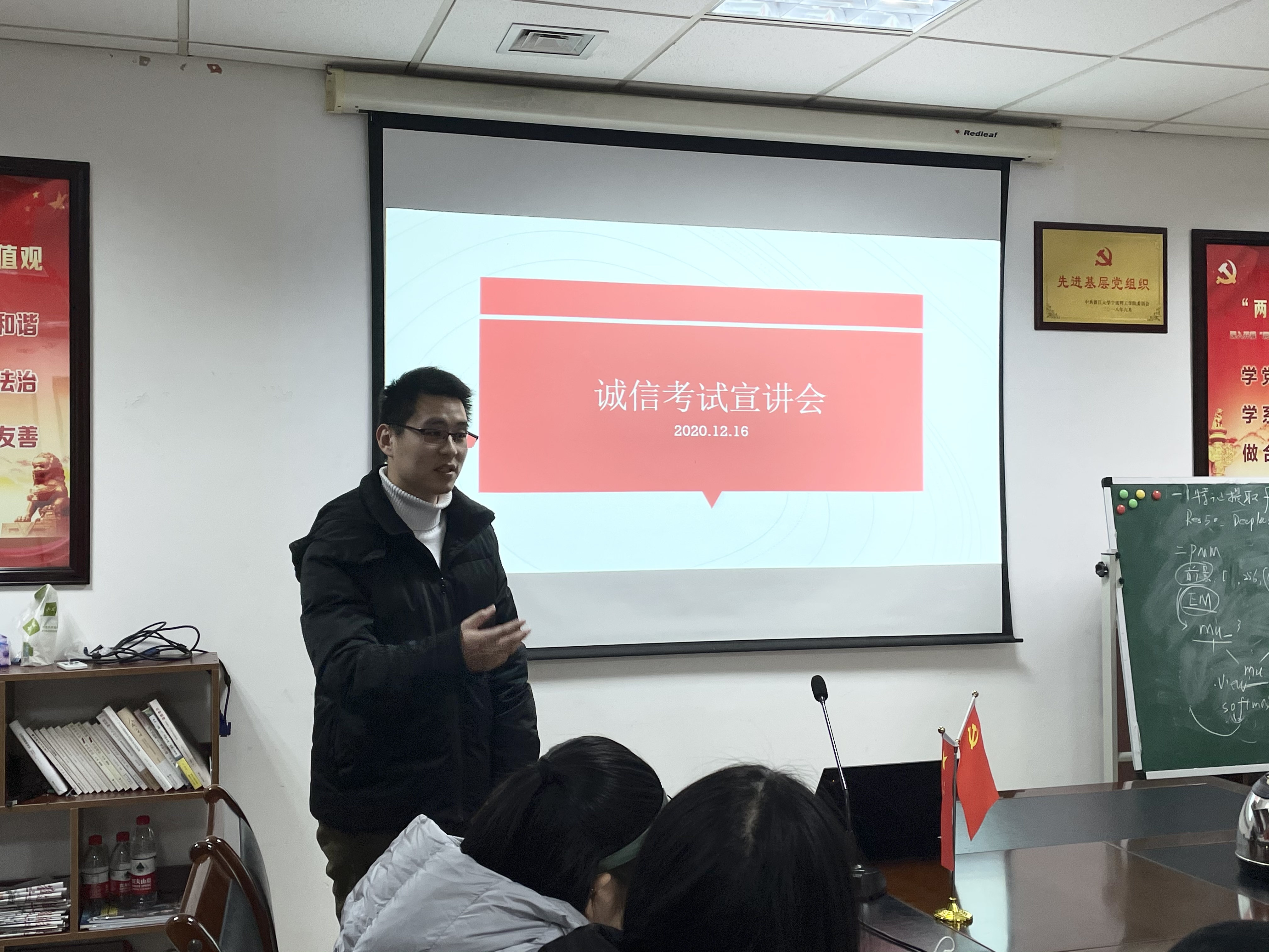 期末考试临近,为大力弘扬诚实守信的社会道德风尚,营造优良学风、校风,杜绝参加国家教育考试和期末考试发生作弊现象,我院于12月16日开展了诚信考试承诺活动,出席本次会议的有学工办奚老师、黄老师和主要学生干部。