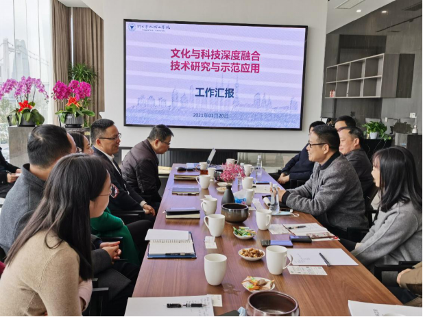 鲁东明副校长首先参观了文创港的沙盘模型,详细了解了文创港的建设背景、规划布局、业态组成等基本情况,并参观了落户文创港的字节跳动、诺丁山艺术中心等科技与文化企业。随后,鲁东明副校长与宁波文创港开发建设中心主任褚有为、宁波江北区科技局局长孙雄鹰开展座谈。 座谈会上,鲁校长详细介绍了我校在科技与文化融合方面的研究基础、发展定位与规划思考。双方就科技与文化融合工作进行深度交流,提出了进一步合作的共同意愿。