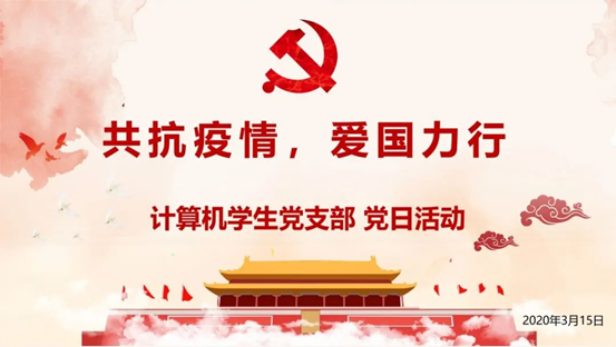 计算机学生党支部以 “共抗疫情,爱国力行”为大会主题,会议分享了支部优秀同志的抗疫工作。支部党员张凡同学分享了参与“甬行码”这一健康数据平台项目的经历和体会。沈祎同学讲述了疫情期间报名参加社区防疫志愿者队伍、拿出奖学金购买物资捐赠社区的感人事迹。王常青老师对参与防疫工作的支部党员予以肯定,并鼓励全体党员也善于学习、掌握本领、奉献社会。