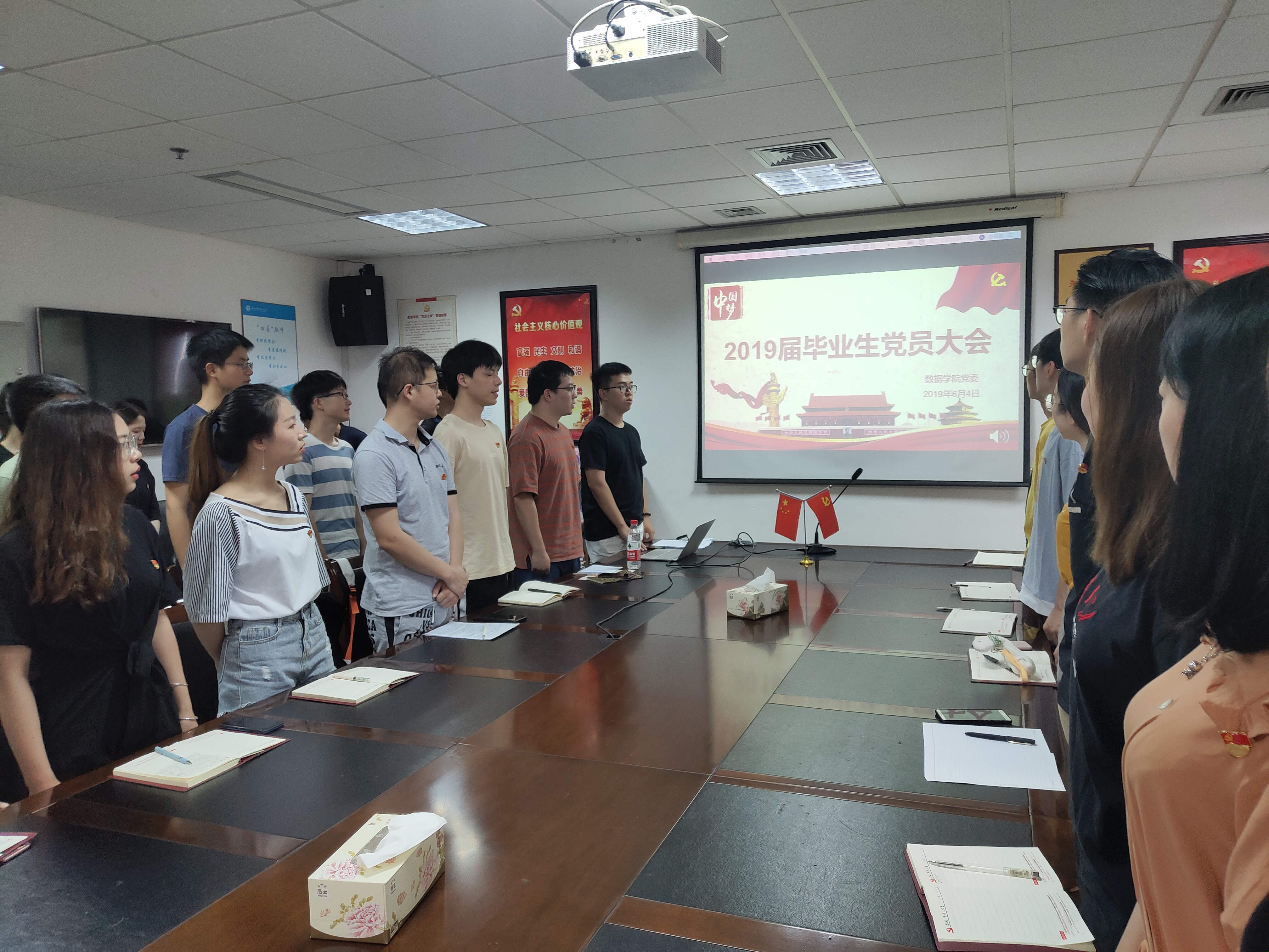 会议在庄严的国歌声中拉开了序幕,数据学生党支部书记马炜栋老师带领全体师生党员一起重温了入党誓词。计算机151班孙颖同学代表全体毕业生党员发言,她满怀深情的谈到了自己在大学期间的学习和工作经历,毕业后也将继续发挥党员的先锋模范作用,实现自己的人生价值为母校争光。