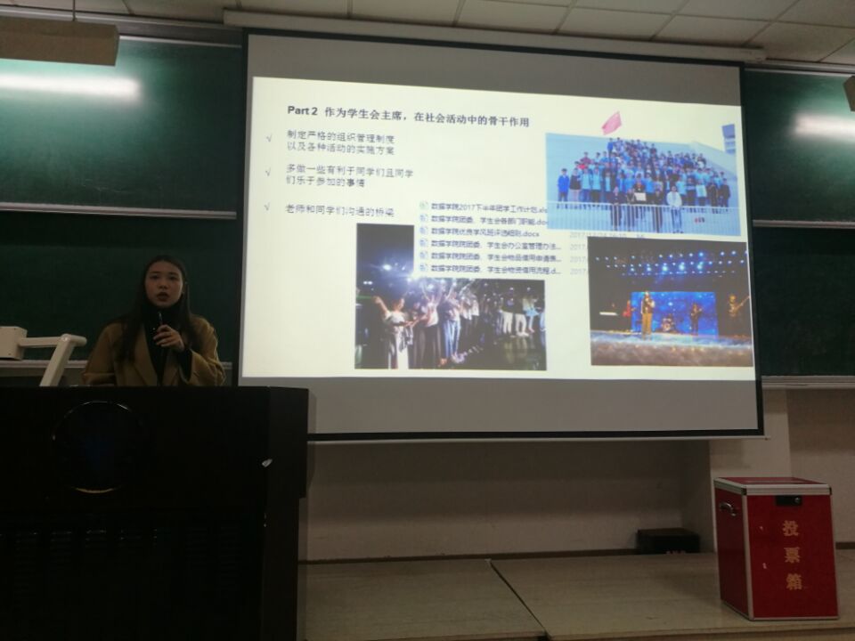 活动开始前主持人介绍了本次评选活动背景并宣布了评选规则。而后10名学生党员按照次序依次上台进行个人展示。在展示过程中每一位党员都紧紧围绕“如何做最美学生党员”这一主题,从政治思想、业务学习、班团建设、社会活动、优良学风建设和文明寝室建设六个方面如何发挥作用进行了阐述,有的党员同志还讲述了党组织培养历程和个人成长过程中的感悟和体会,诠释了作为一名共产党员如何履行党员权利和义务,如何做普通同学的模范和榜样。在各位党员展示的PPT中,他们不计其数的奖状也从一个方面证明了他们的优秀。
