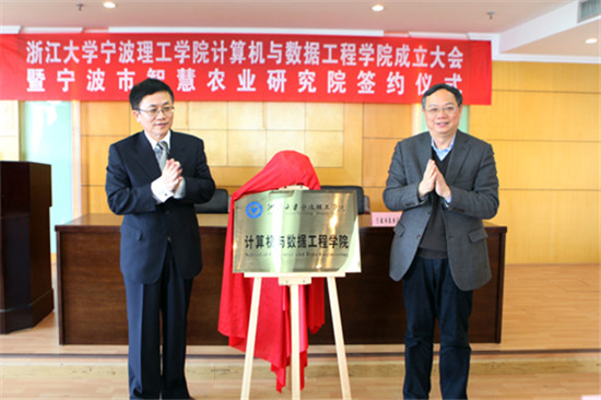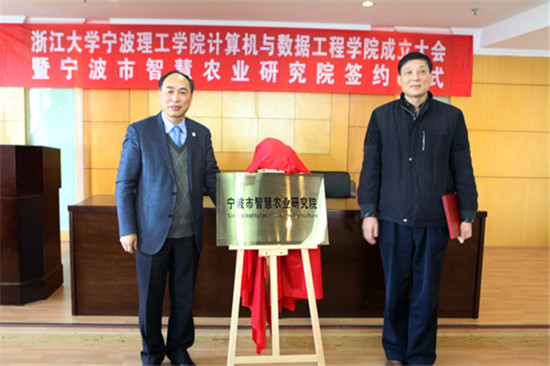 会上,宁波市智慧农业研究院举行签约仪式,宁波市农业局巡视员张凤谦、学校党委书记费英勤代表双方签约,并为宁波市智慧农业研究院揭牌。
