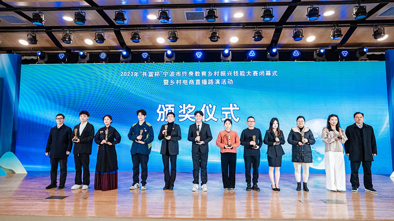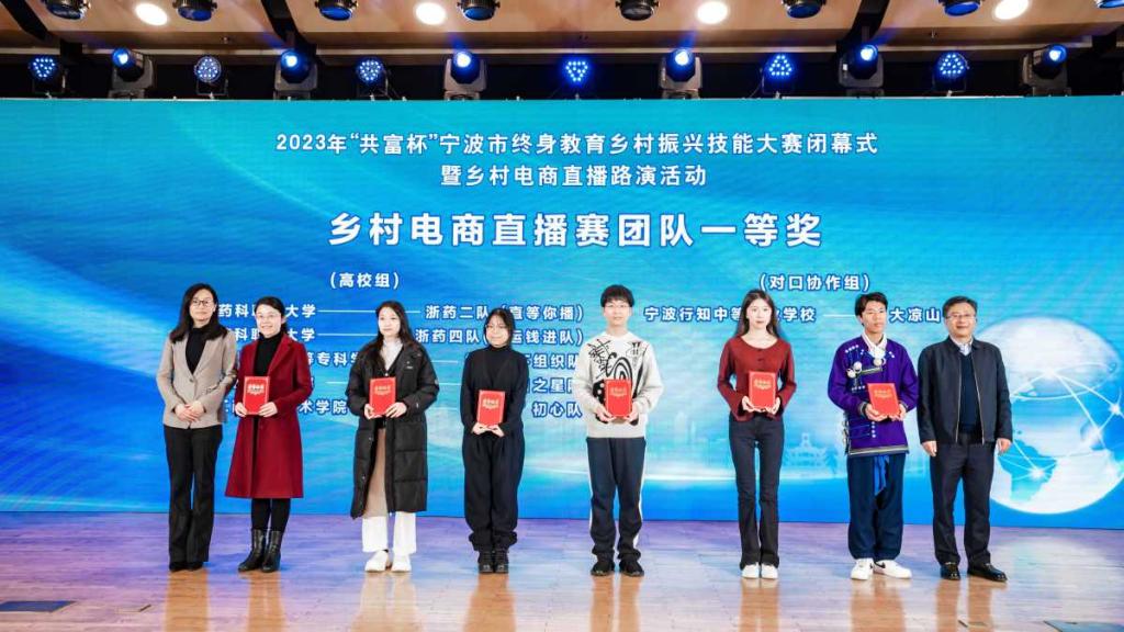 教育服务乡村,直播助力共富。12月25日,2023年“共富杯”宁波市终身教育乡村振兴技能大赛在宁波日报报业集团精彩落幕。本次大赛由市教育局、市商务局、市农业农村局、宁波日报社联合主办,历时2个月,集聚教育优势资源,挖掘培育数字贸易人才,引导更多群体积极投身乡村振兴实践,吸引了全市各区(县、市)以及四川凉山州、安徽蚌埠、贵州黔西南州等宁波对口协作地区200多支团队、650余名青年选手踊跃参加,展示青春风采,赋能共同富裕,点亮美丽乡村。