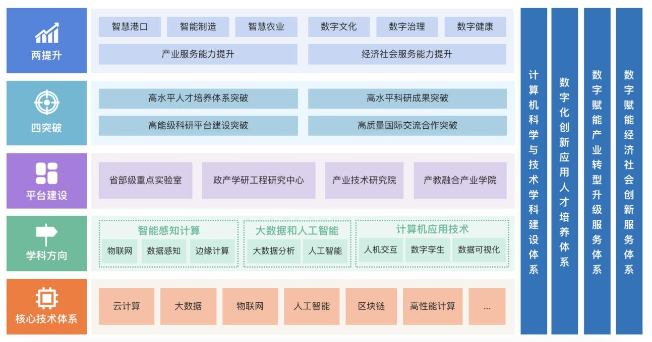 该学科围绕新一代信息技术及国家战略需求,以宁波建设现代化滨海大都市的总体目标为指引,学科紧密结合产业和经济社会发展需求,构建跨学科产学研平台体系,推动港产城文融合发展。学科以科技创新赋能宁波产业为主线,注重与港口物流、制造业、文化产业、生命健康、社会治理、农业工程等其他学科的交叉融合,目前已建设有城市智能技术与应用宁波市工程研究中心、宁波市智慧农业研究院以及宁波市(鄞州)信创联合实验基地、浙大宁理-亮鲸网络、浙大宁理-数智工场大数据与人工智能企业联合实验室等产学研平台,新增9728太阳集团文化数字化创新实验室以及积极申报宁波市新型智能计算重点实验室。