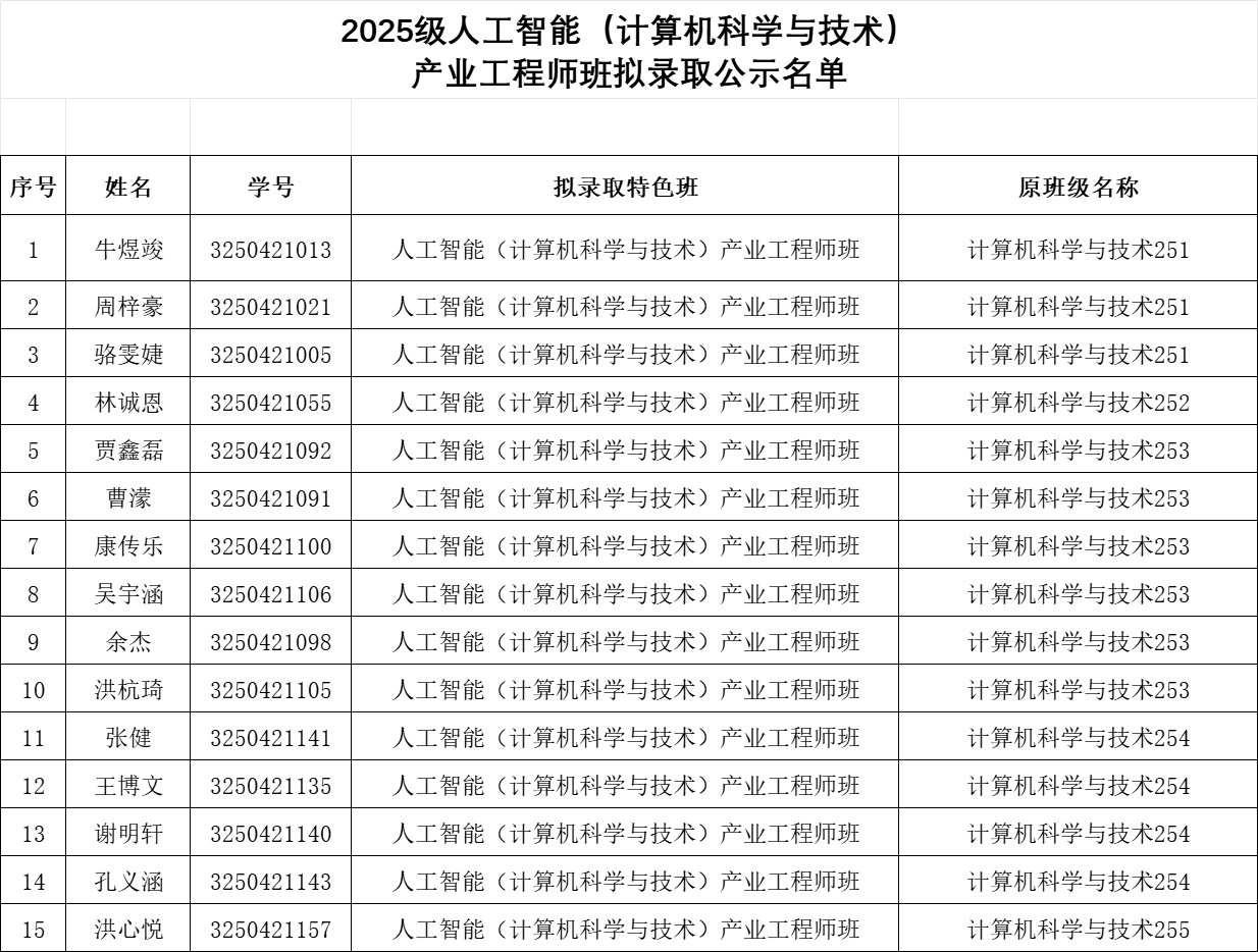 根据学校2025级产业工程师班学生选拔工作安排,经学生申请,学院资格审查并组织面试后,拟同意牛煜竣等15名同学入选2025级人工智能(计算机科学与技术)。现将具体名单予以公示如下。